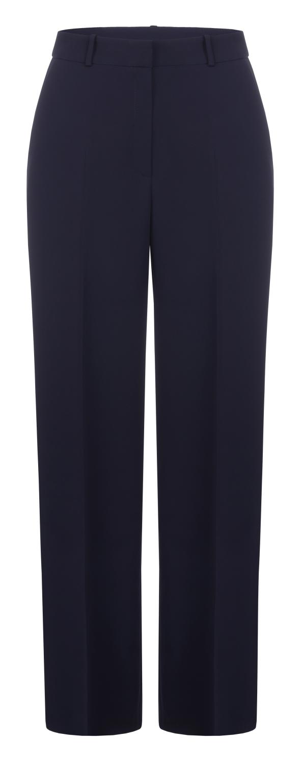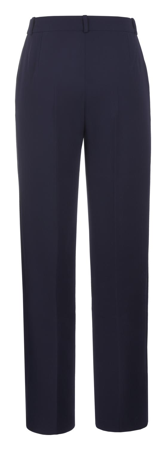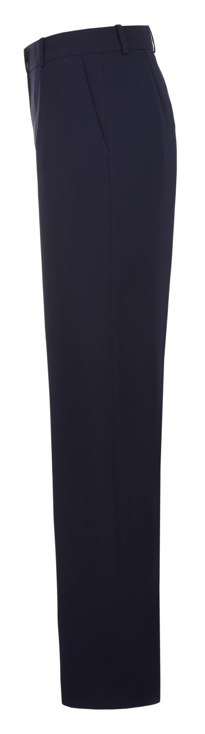 Marinblå kostymbyxa med normal midja och bred benlije med pressveck. Denna modell har dragkedja med hake och midjeband med bälteshällor.