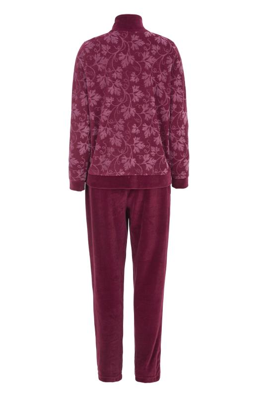 Tvådelad velourdress med en snyggt mönstrad jacka och en enfärgad byxa i säsongens vinröda färg.