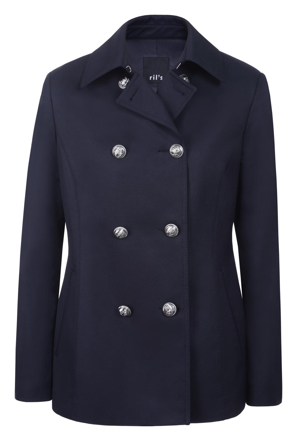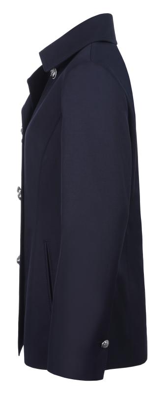 Klassisk kort kappa med dubbelradig knäppning och metallknappar med ankarmotiv. Ärmarna har knapp och slitsdetalj.