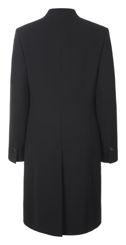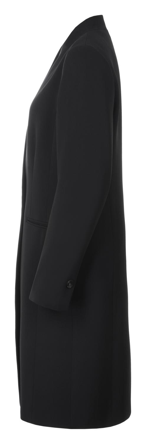 En lång och elegant kavaj i en lätt figursydd modell. Kavajen är kraglös och vackert skuren i halsen så att den går upp runt nacken.
