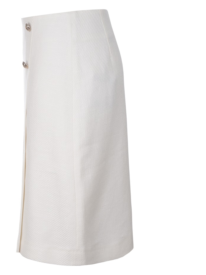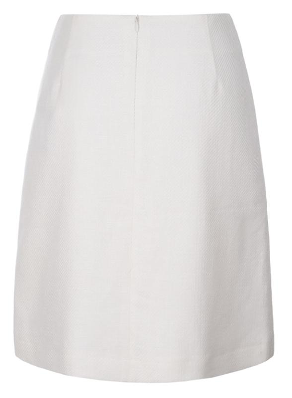 Knälång kjol med snedsluten fåll och ett veck framtill. Materialet i denna högkvalitativa linne- och ullblandning har en vacker fiskbensstruktur.