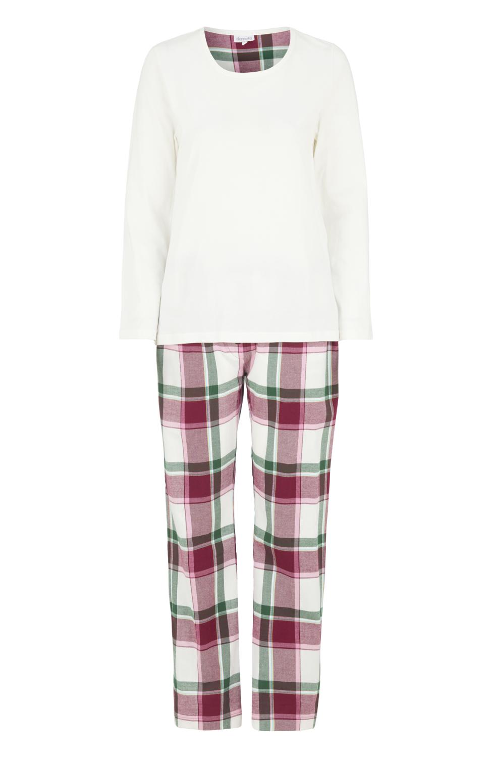 En mjuk och skön tvådelad pyjamas med en vit bomullstrikå överdel och en rutig byxa i en mjuk och härlig flanell.