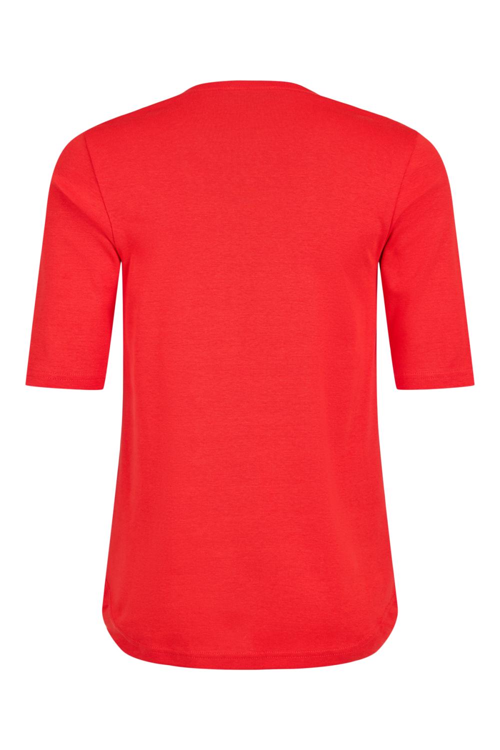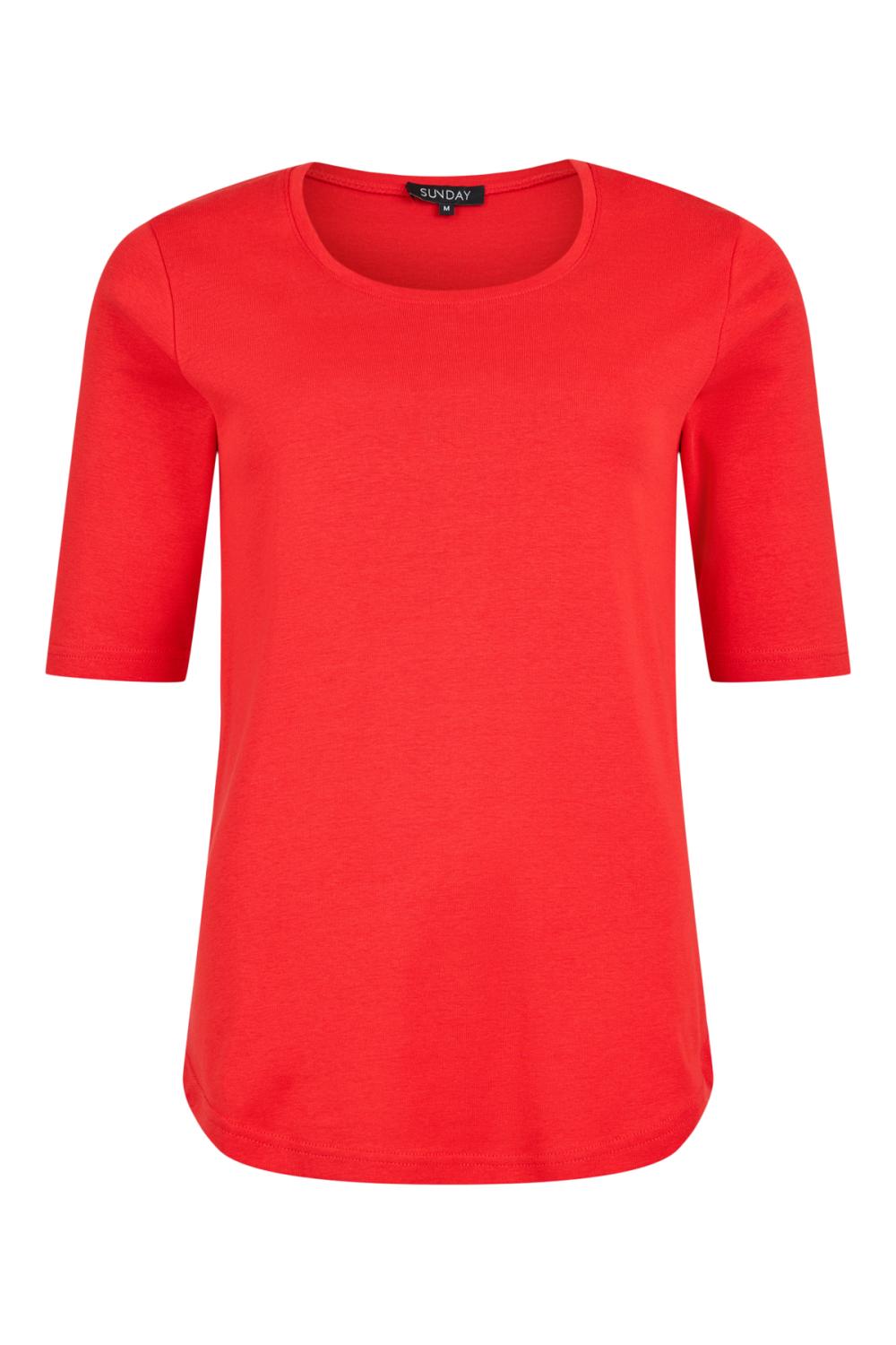 T-shirten har en lite längre ärm och avslutas något rundad nertill.